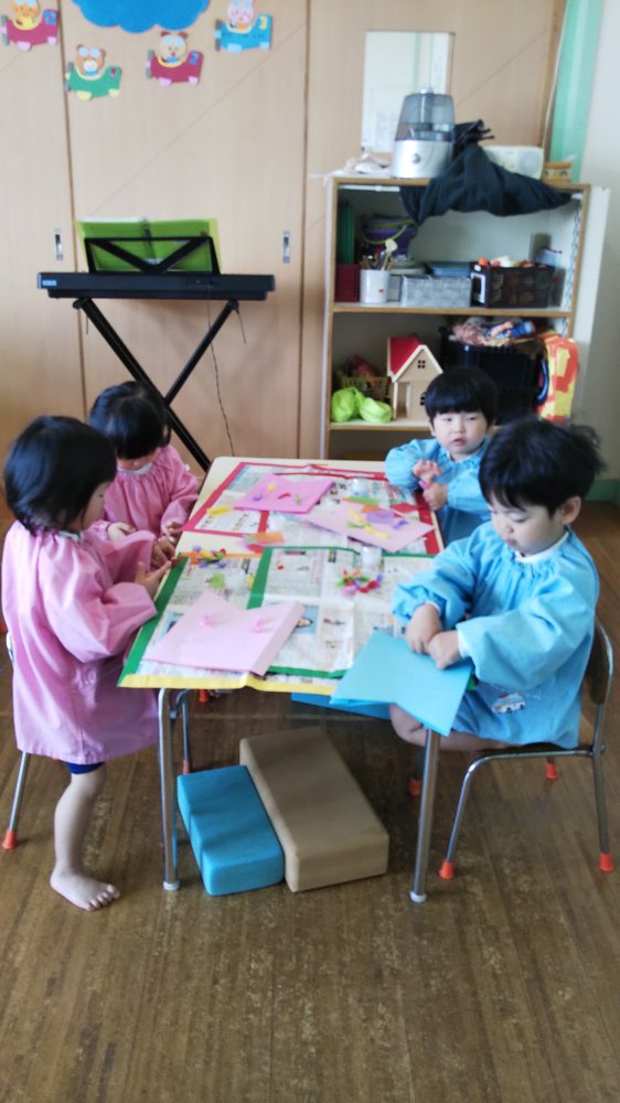 のり付けも自分でして新しいクレヨン🖍を使ってお絵描き(^ ^)とても可愛い作品に仕上がりましたー♪