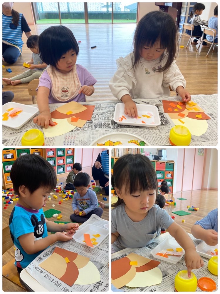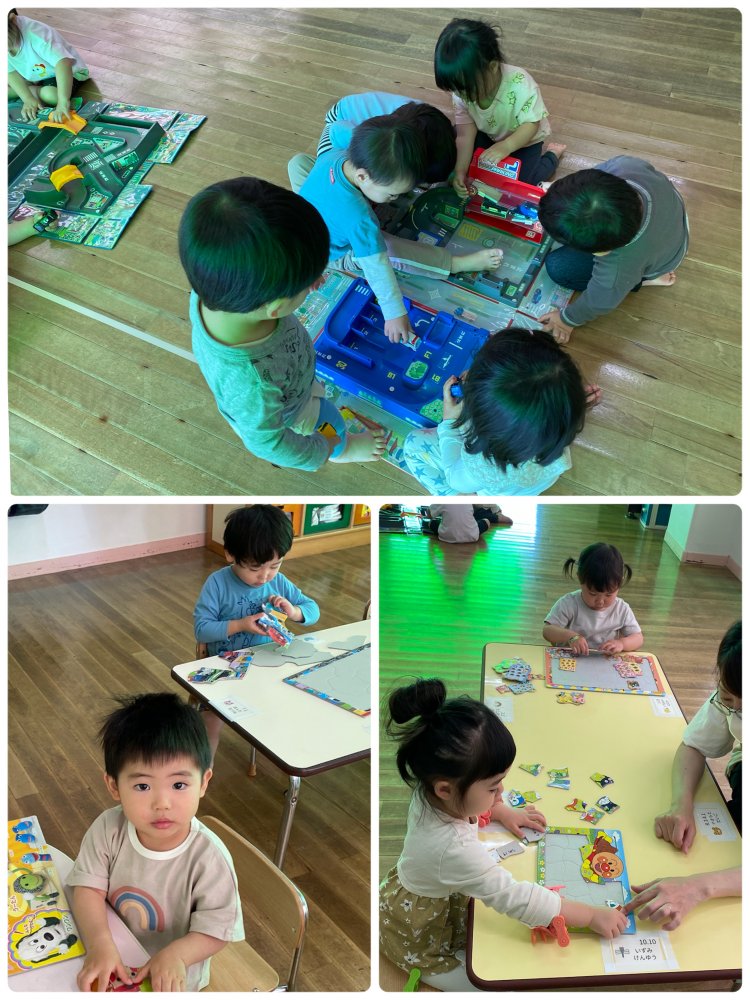 おままごとやお人形、パズル、トミカ 、ビーズ通し、チェーンリング等から2、3種類をチョイスして遊んでいますよ。