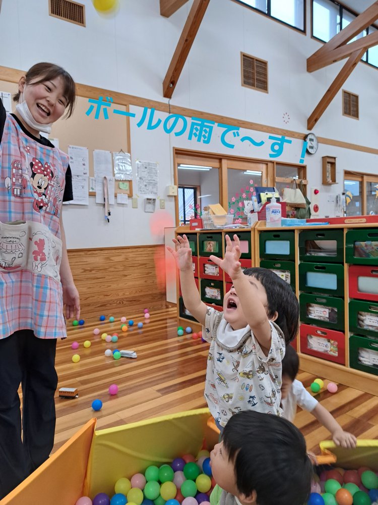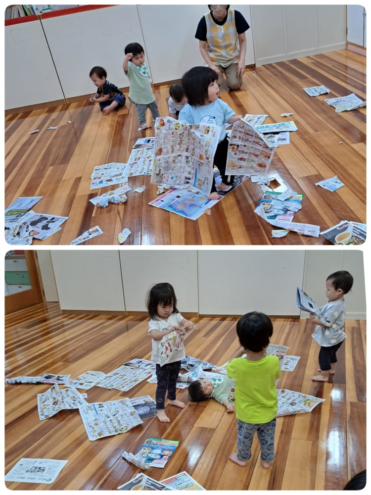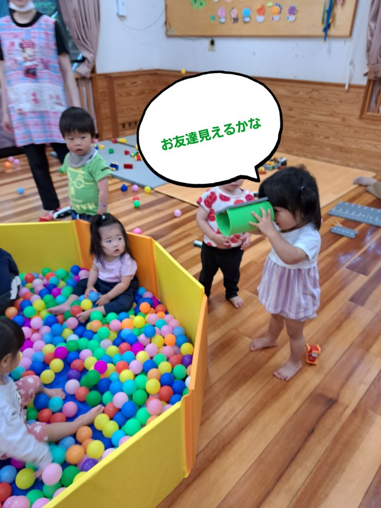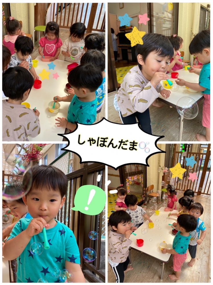 赤組さんはシャボン玉遊びを始めました。シャボン玉液を付けないで吹く練習をしてから遊びましたよ👍