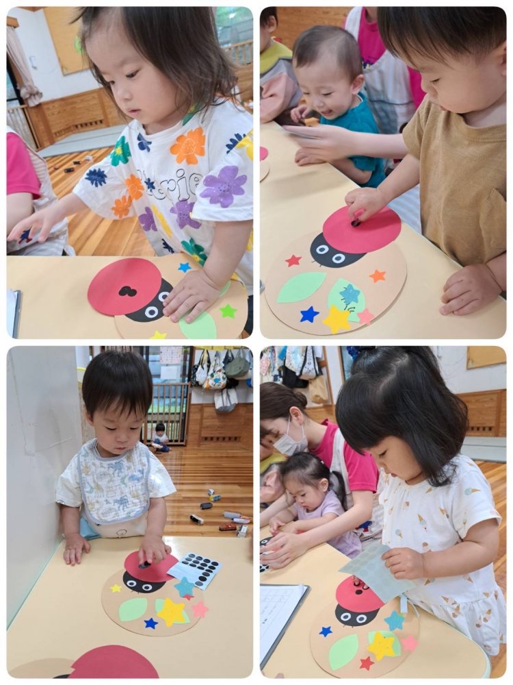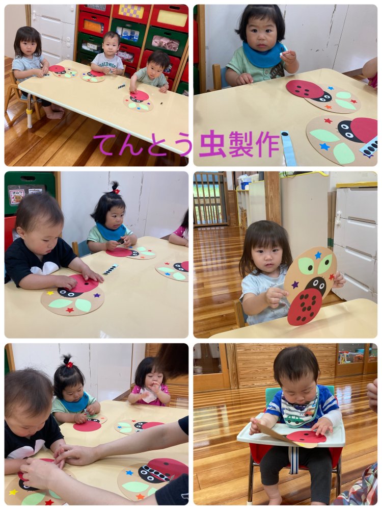 雨の日は室内遊び!てんとう虫製作を行いました。黒色の丸型シールをてんとう虫の背中にペタン!可愛い作品に完成しました