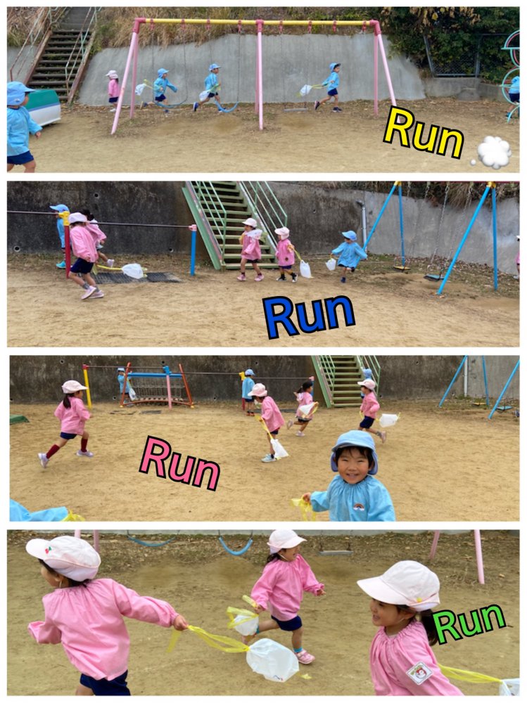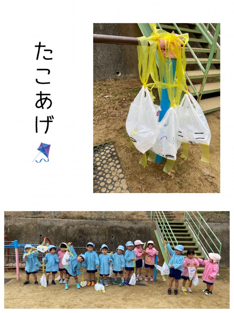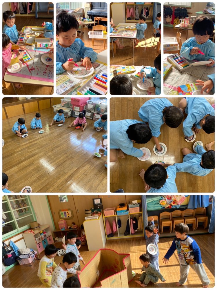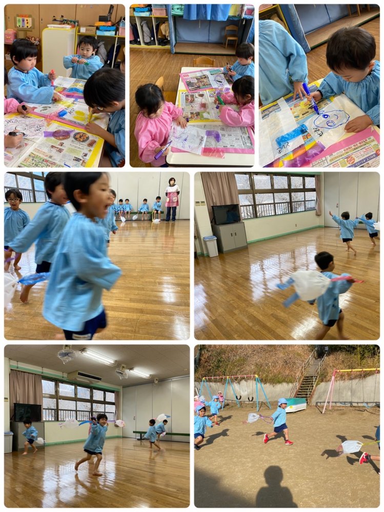 凧揚げでは、凧に好きなように絵を描き、ひもをつけると、早速お遊戯室や園庭をぐるぐる走っていました🏃♀️