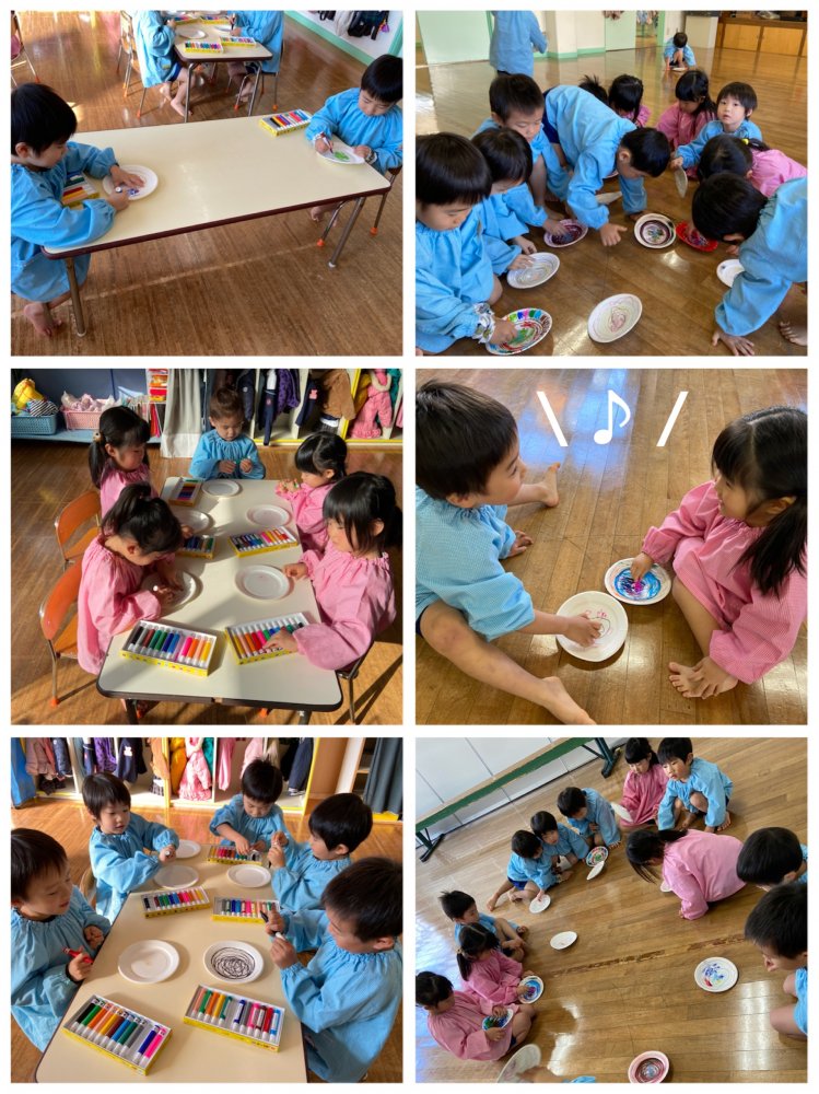 マーカーで描く時、「回したらどんな色になるのかなぁ」と考えながら彩っていく子どもたちでした。