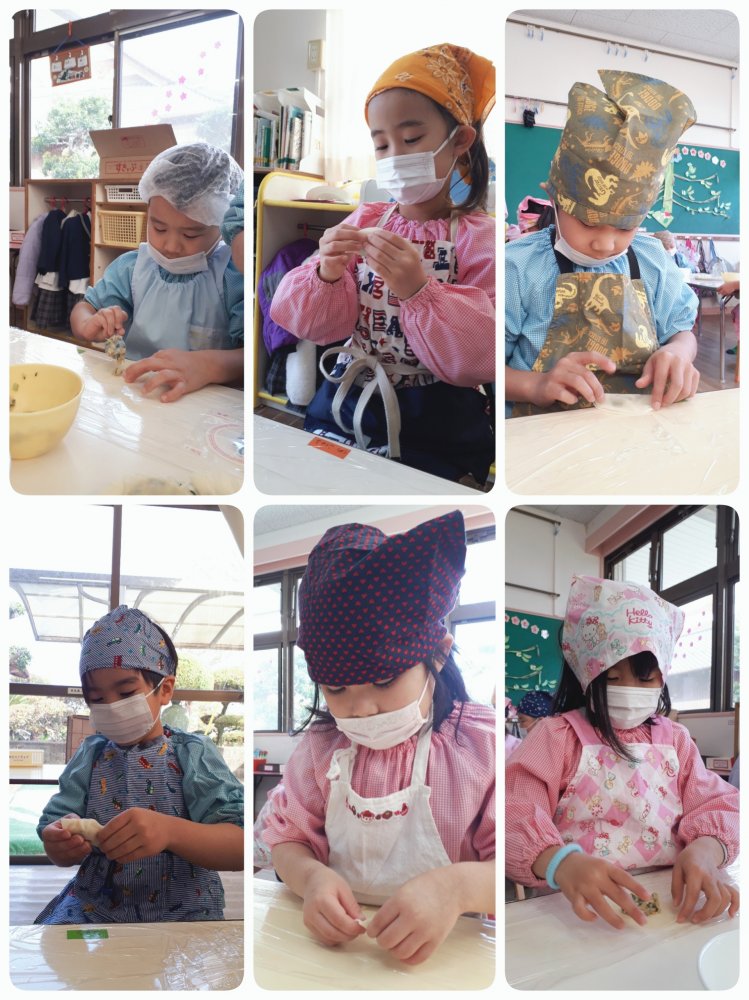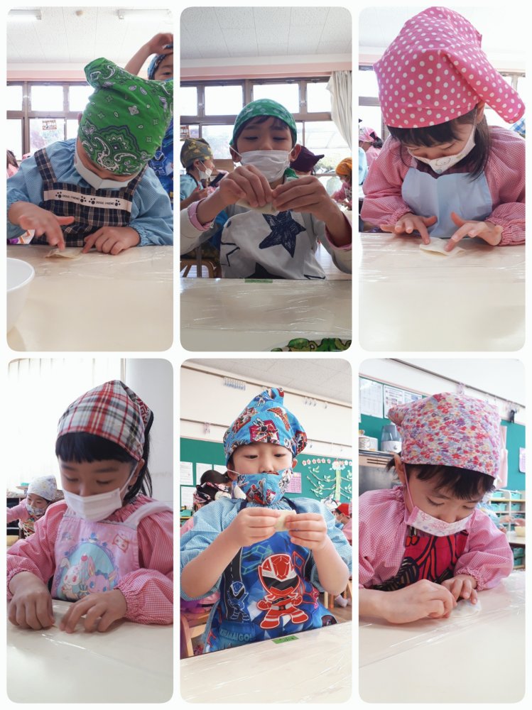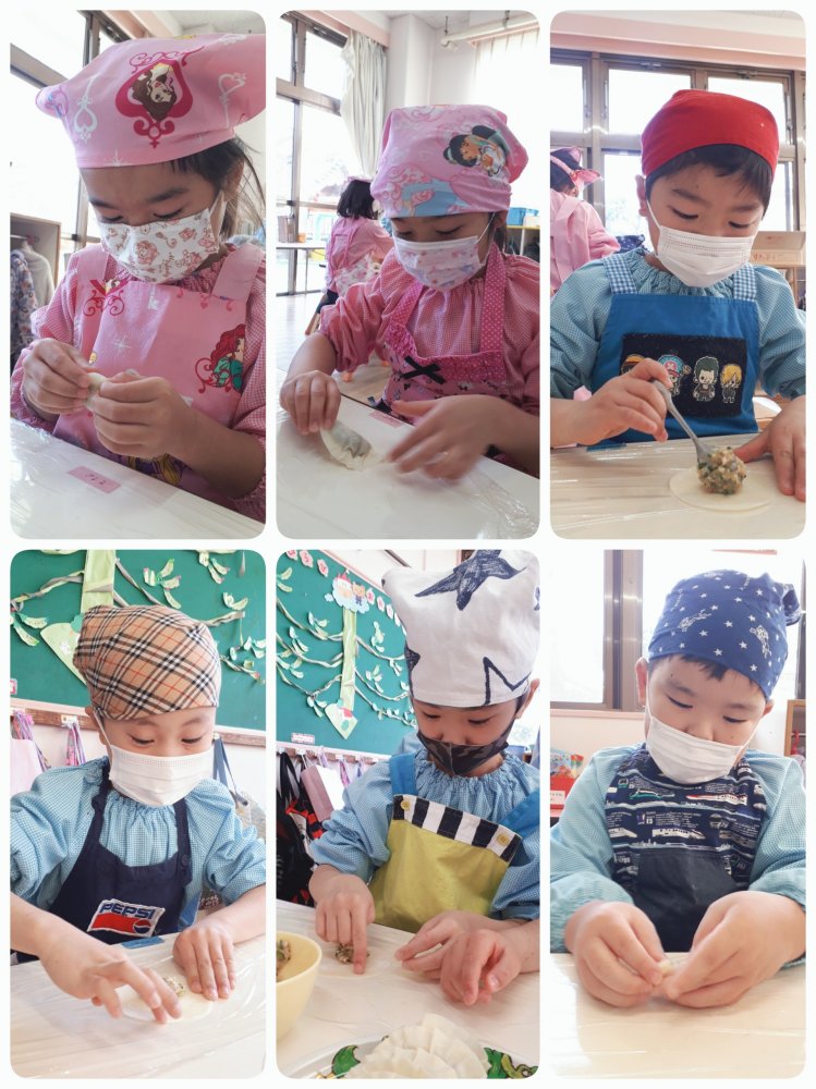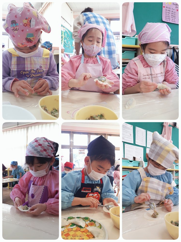『先生‼このくらい!?』と担任に確認はとるものの、絶妙な量の具を皮の真ん中に置いて、しわを寄せて包んでまいります🙋