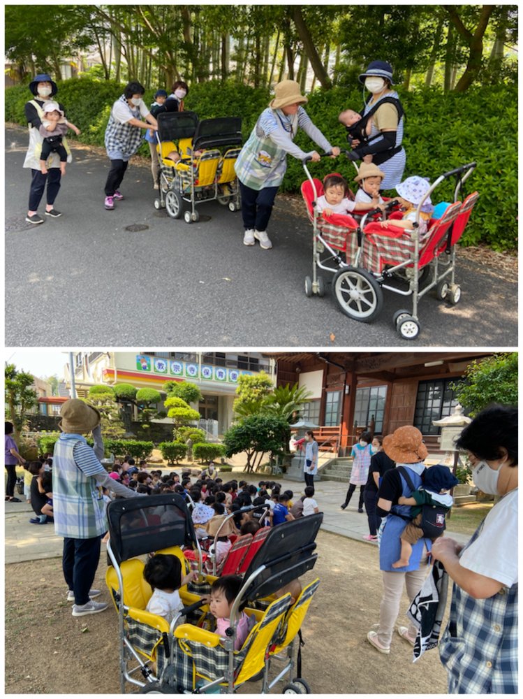今回の避難場所は境内で、たんぽぽ組のべいびーちゃんたちは、訳もわからず保育者にせっせと抱っこされ、ベビーカーへ…「ん?そんなに急いでどこに行くの?」という表情の子どもたち👶🏻✨