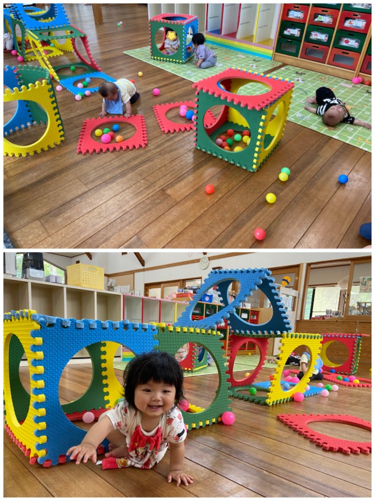 ソフトマットのトンネルをくぐったり、ボールを追いかけたり…