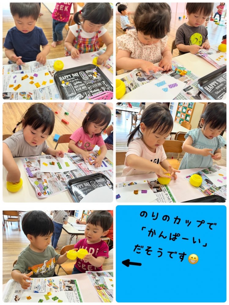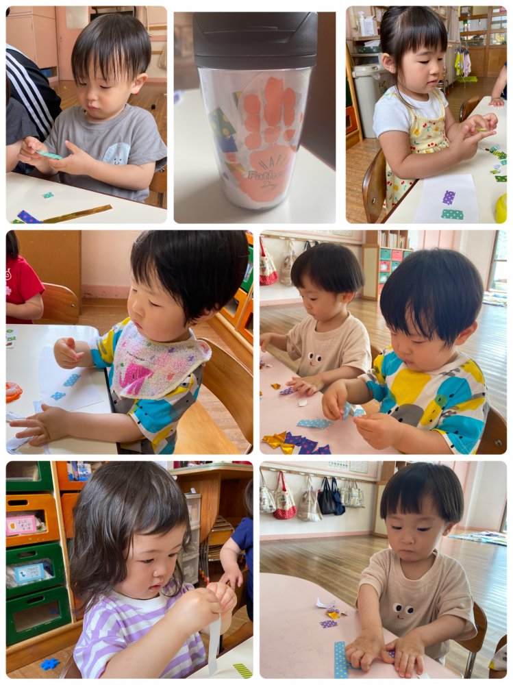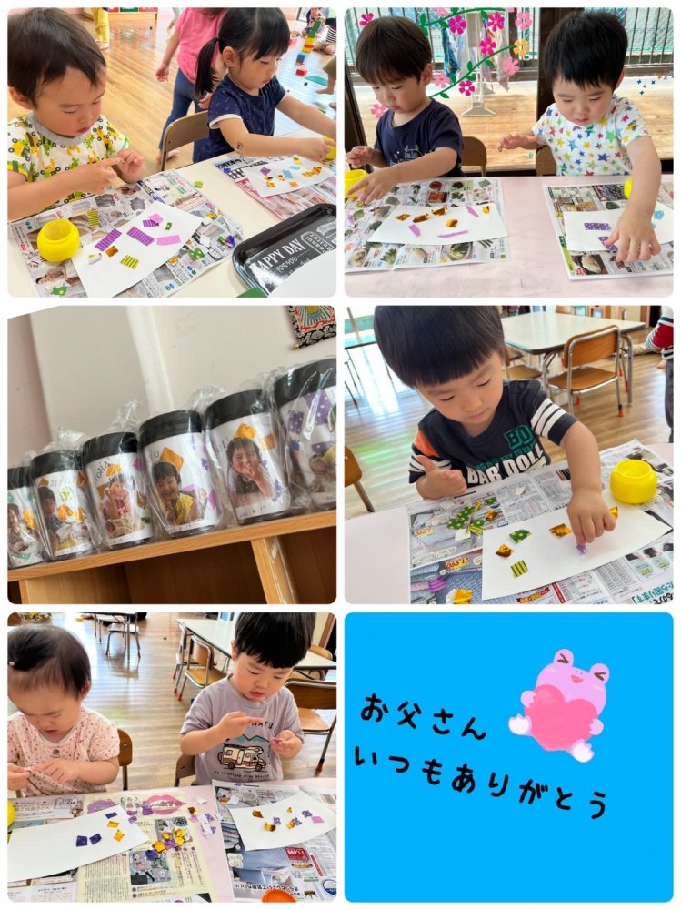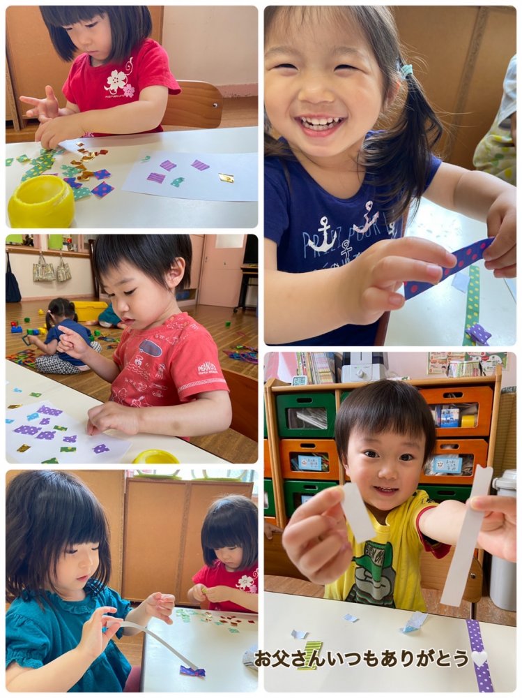 折り紙をちぎったり、貼ったり少しずつ出来ることが増えてきて・・毎回目をキラキラさせて製作を楽しむ子供達✨今回は、大好きなお父さんの為に気持ちを込めて・・一生懸命作りました😊😊「ありがとう」言えるかな😊