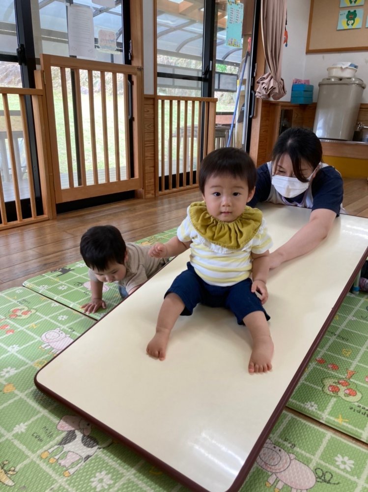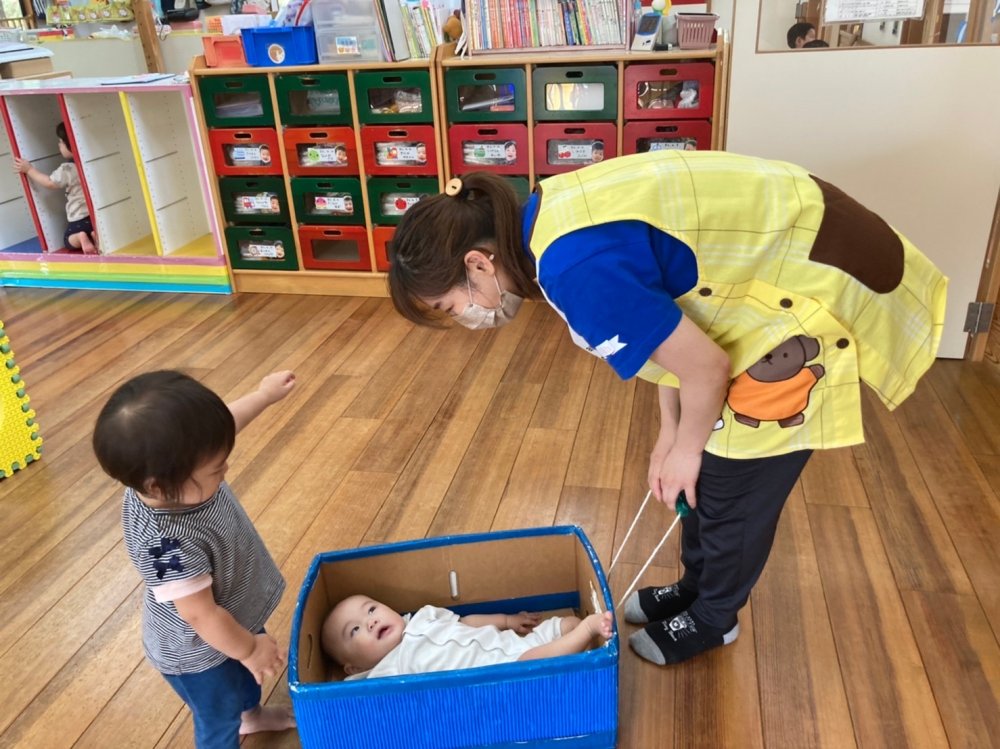段ボール電車では、ゆら〜り ゆら〜り先生たちに引っ張られて、なんだかいい気持ち😊