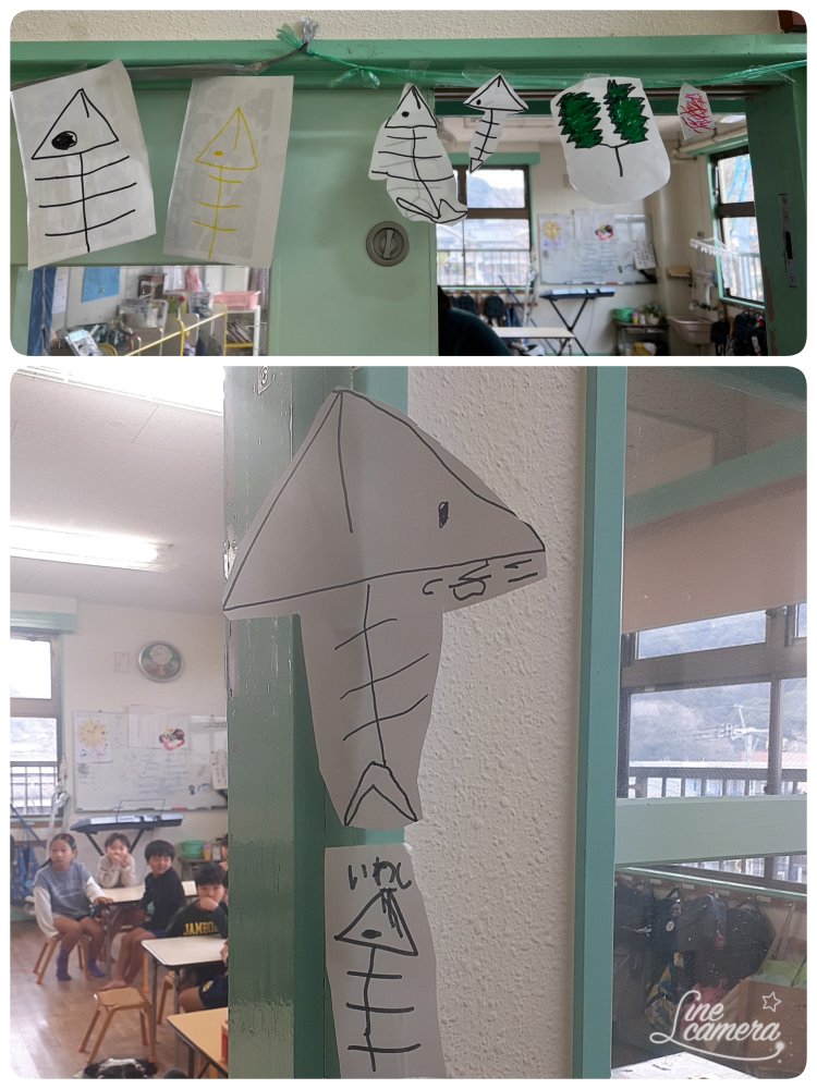 紙芝居にかいていた鬼の苦手なイワシの頭とヒイラギの葉を書いてドアに張り付けていました😁
