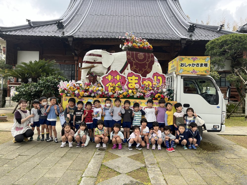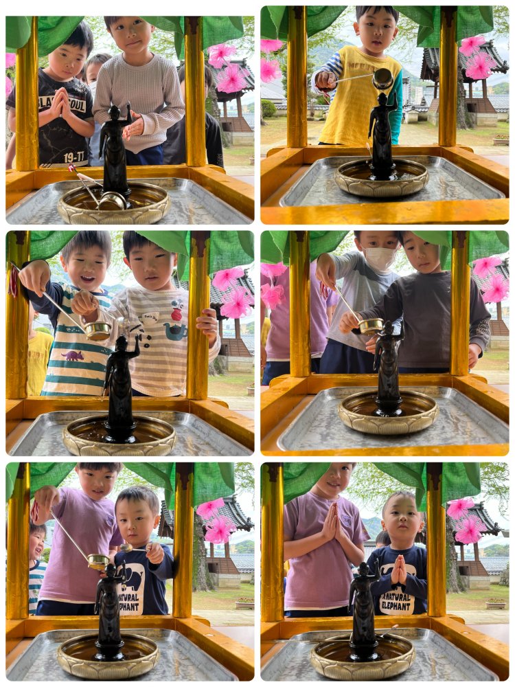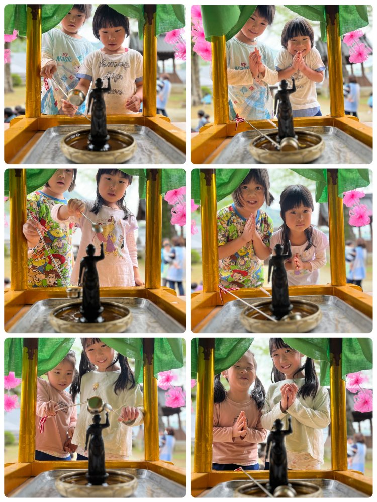 お釈迦さまのお誕生日をみんなでお祝いし、花御堂で甘茶をかけました。