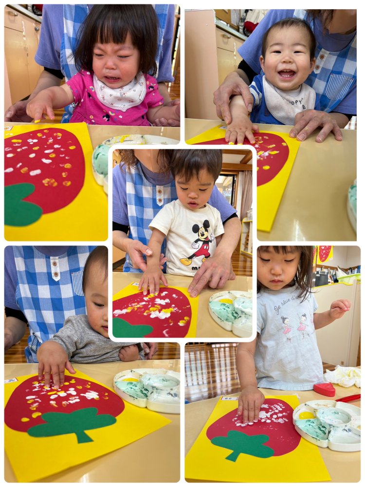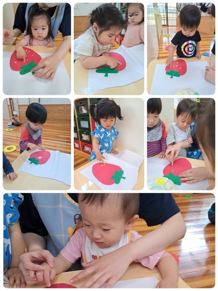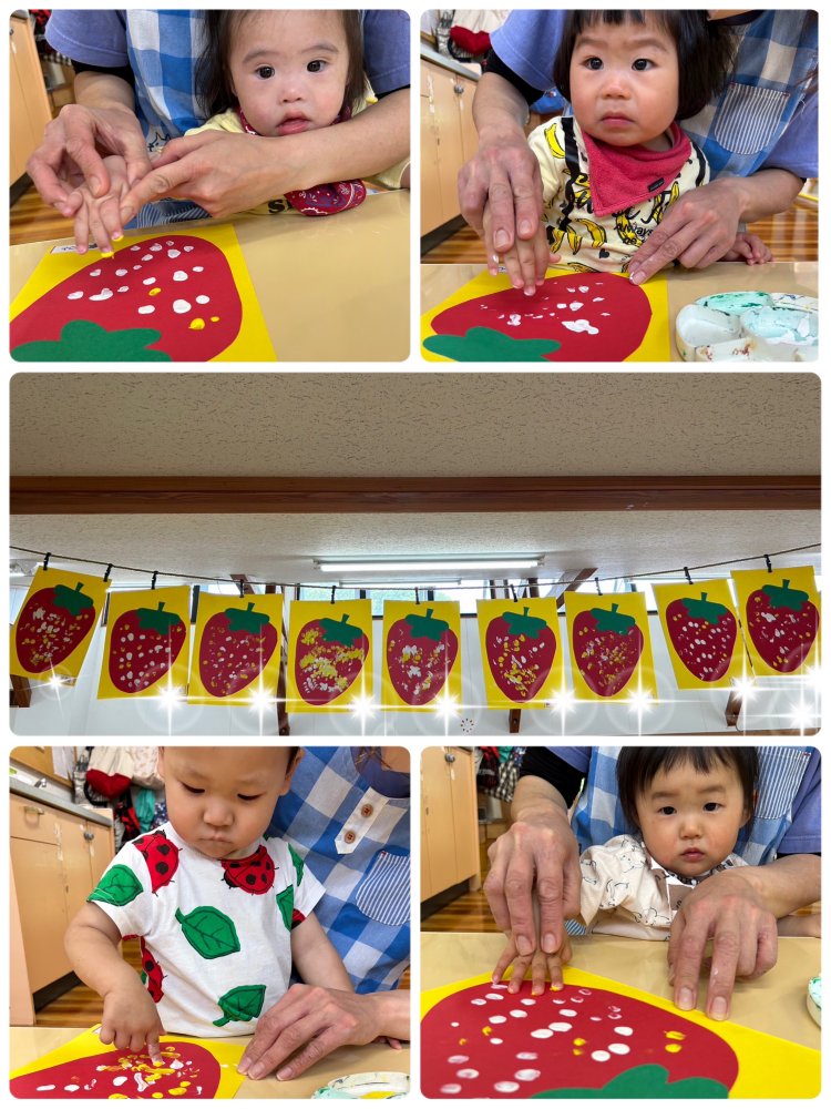 苺のお製作!苺の形に切った画用紙に、指に絵の具を付けてスタンプ!種を描きました!ペタンと絵の具の感触を楽しみながら美味しそうな苺が完成🍓